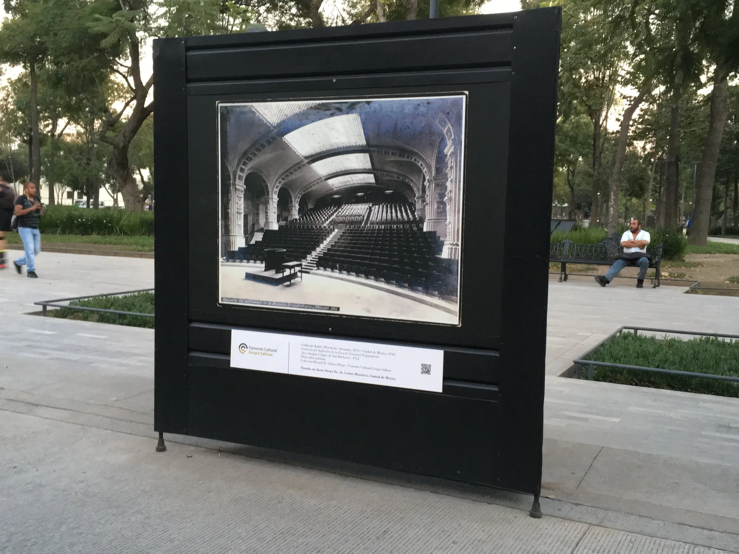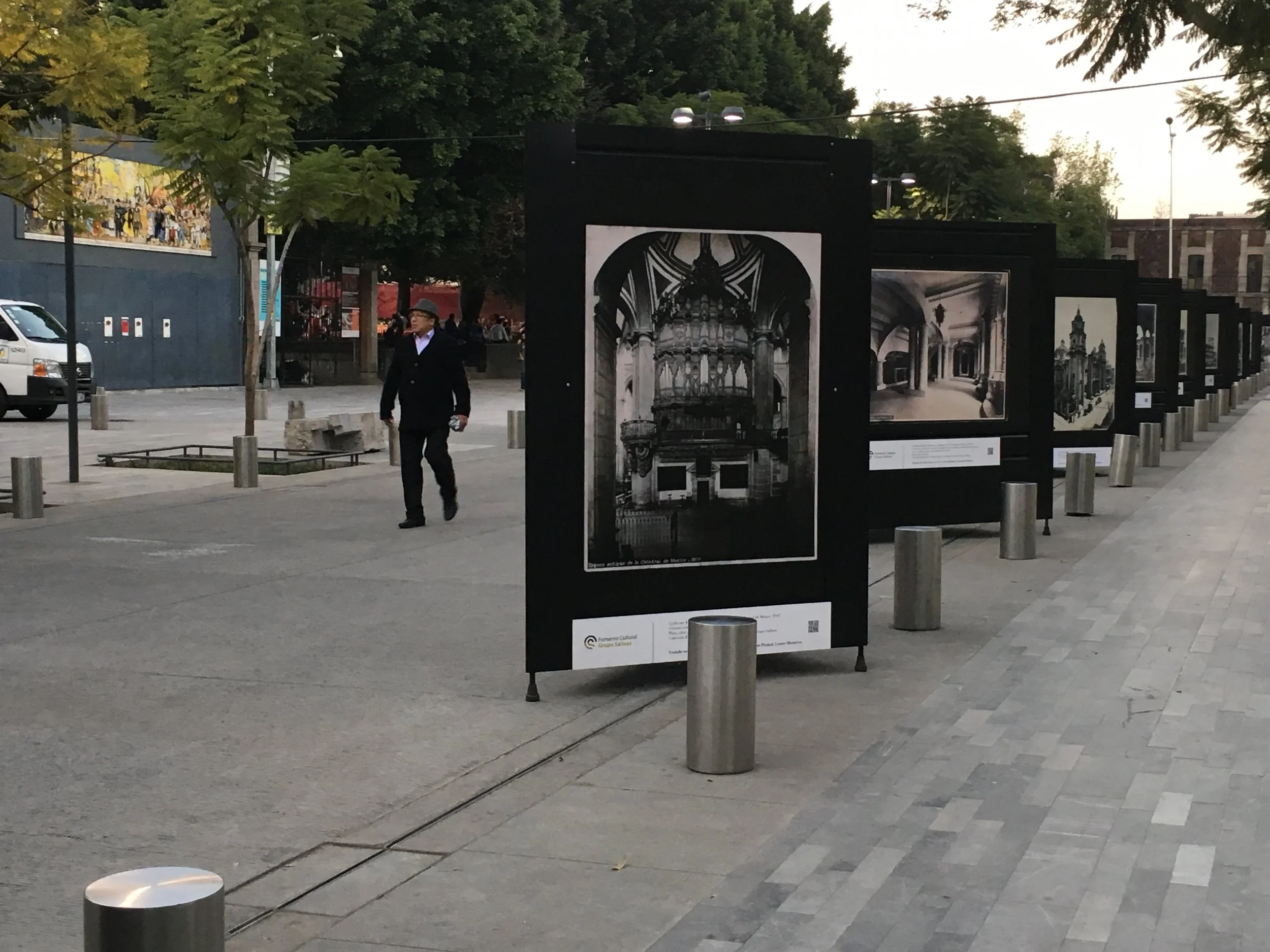 Mexico City. Two examples of outdoor photography exhibitions. The first with floating panels, horizontal and vertical, open at the bottom. The weights are part of the look and feel.