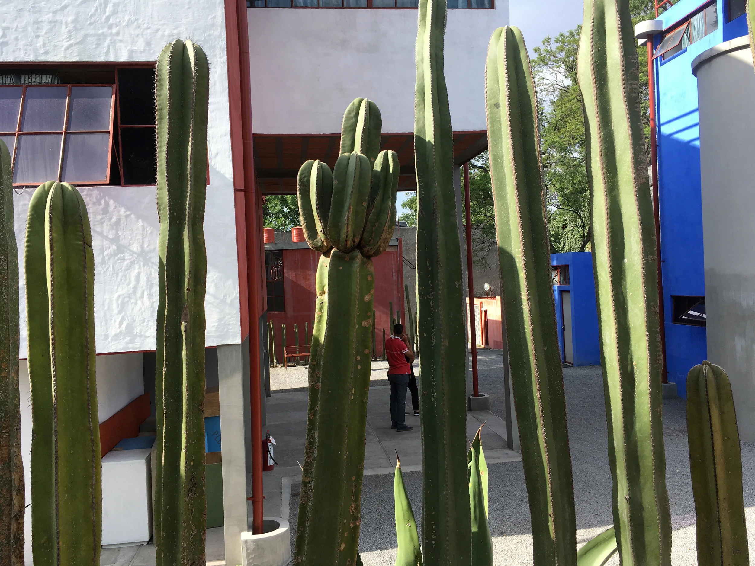 Mexico City. El Museo Casa Estudio Diego Rivera y Frida Kahlo is just one of the many museums related to these two artists. Here, the first encounter is a living fence of cactus that appears to be the only security surrounding the buildings. I wonder if they have guards on constant duty?