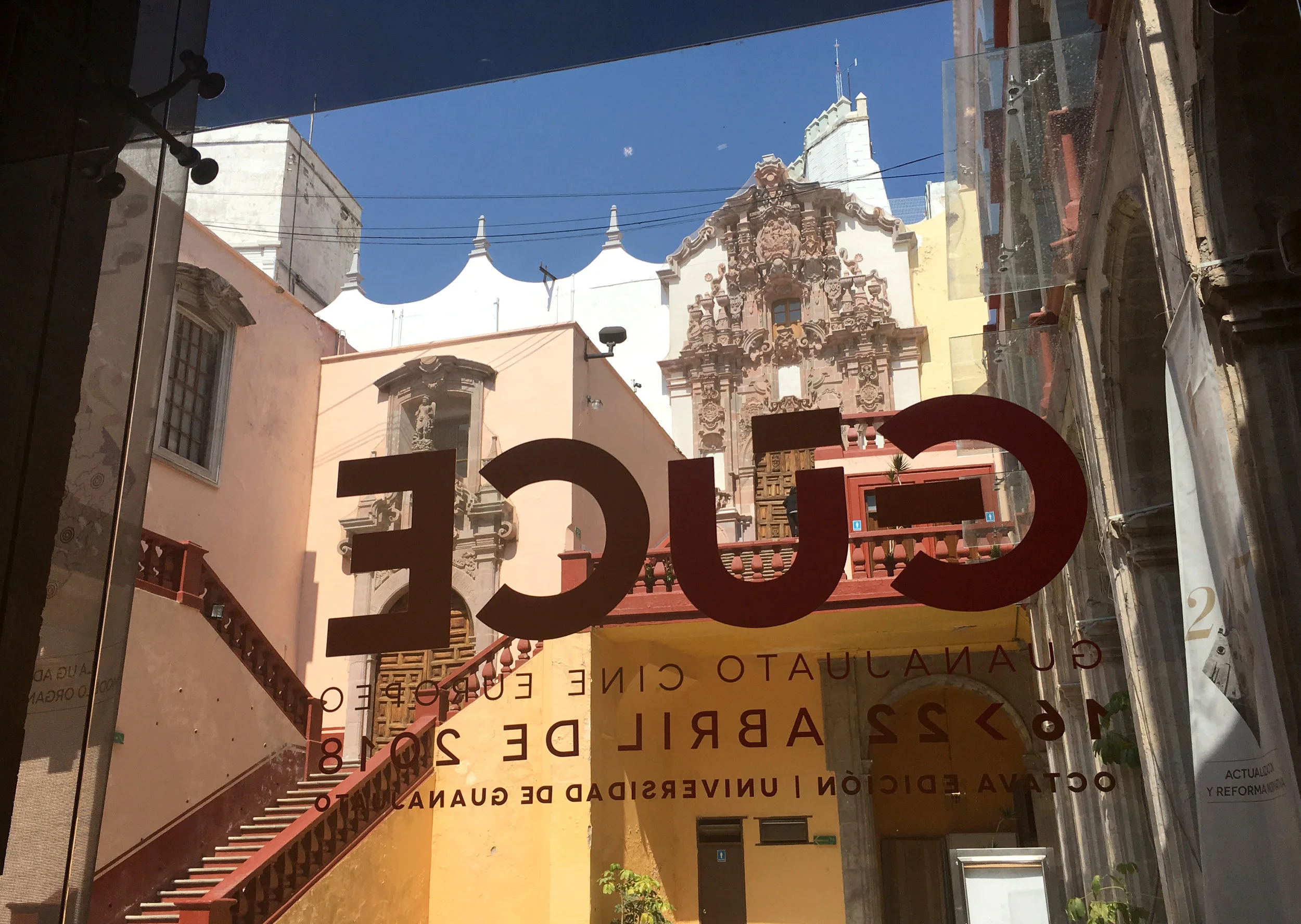 Guanajuato, Mexico. Guanajuato University Cine Europa. Typography on window glass is like a book cover, a composition of typography over a photograph. Except that the photograph is alive and changing. Like a film.